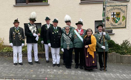 Aus unserem Bezirksverband gehörte zu der Heerschar an Gästen eine Abordnung von 9 Mitgliedern, an der Spitze die Bezirksmajestäten Bezirkskönigin (hist.) Patricia Busa (St. Sebastianus Heimersheim), Bezirkskönig (sportl.) Josef Laux von St. Matthias Brohl sowie für diesen Tag der Bezirksstandartenträger Rüdiger Heuser (St. Sebastianus Heimersheim) sowie Bezirksbundesmeister Sigi Belz mit Gattin Kati sowie weitere Mitglieder aus dem Bezirksvorstand und den Mitgliedsvereinen u.a. mit Brudermeister von St. Matthias Brohl Peter Nonn und weiteren Schützen aus St. Matthias Brohl und St. Hubertus Königsfeld (siehe Foto) teil.