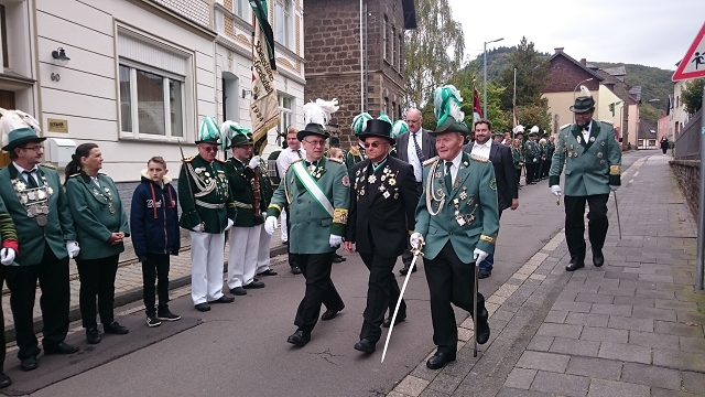 Anschließend nahmen die Schützen vor der Pfarrkirche Aufstellung zur Totenehrung. Am Ehrenkreuz legte Bezirksbundesmeister Belz eine Gedenkschale nieder. Bezirkspräses Ritterrath gedachte in einem kurzen Gebet den Opfern aller Kriege und aller verstorbenen Schützenschwestern und Schützenbrüder. Unter den Klängen der Rhein-Ahr-Spatzen und des Brohler Musikvereins „Fidelio“ marschierten dann die Schützen durch Brohl zum idyllisch gelegenen Schützenhaus.